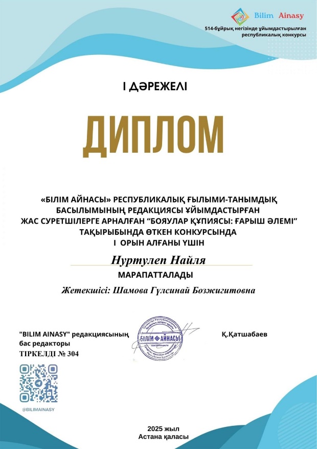 «БІЛІМ АЙНАСЫ» Республикалық ғылыми-танымдық басылымның редакциясы ұйымдастырған жас суретшілерге арналған «Бояулар құпиясы: Ғарыш Әлемі» тақырыбында өткен  өткен конкурсында тәрбиеленушіміз Нуртулеп Найля қатысып жүлделі I орынды иеленді. 2025 жыл, сәуір айы.