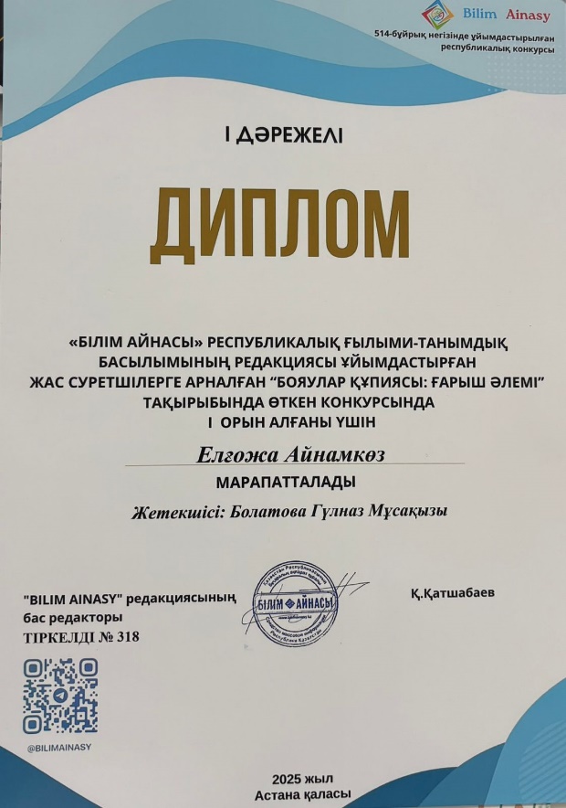 «БІЛІМ АЙНАСЫ» Республикалық ғылыми-танымдық басылымның редакциясы ұйымдастырған жас суретшілерге арналған «Бояулар құпиясы: Ғарыш Әлемі» тақырыбында өткен өткен конкурсында тәрбиеленушіміз Жамбыл Айару қатысып жүлделі I орынды иеленді. 2025 жыл, сәуір айы.