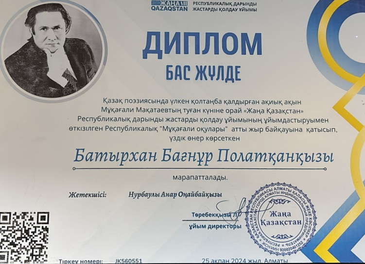 Қазақ поэзиясында үлкен қолтаңба қалдырған ақиық ақын Мұқағали Мақатаевтың туған күніне орай «Жаңа Қазақстан» Республикалық дарынды жастарды қолдау ұйымының ұйымдастыруымен өткізілген Республикалық «Мұқағали оқулары» атты жыр байқауына тәрбиеленушіміз Батырхан Бағнұр үздік өнер көрсетіп Бас жүлде иеленді. 2024 жыл ақпан айы.