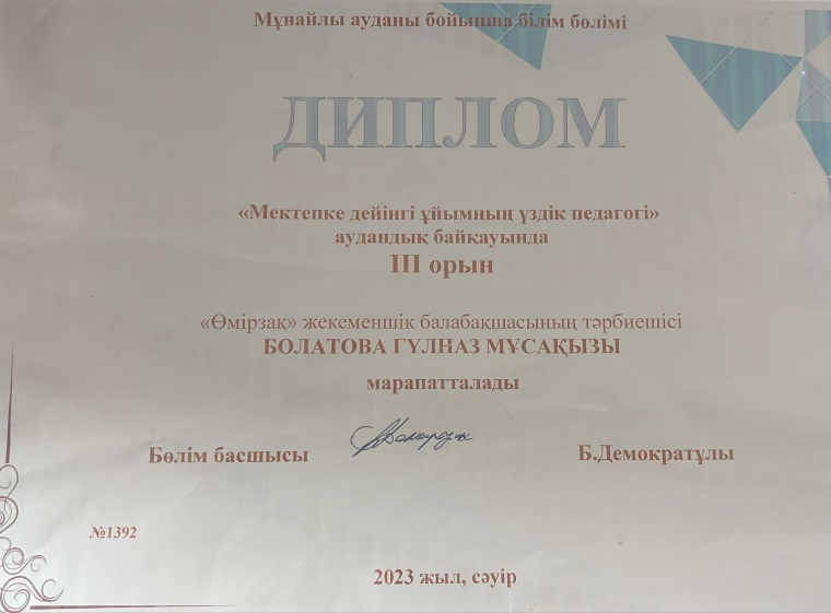 Мұнайлы аудандық балабақша педагогтері арасында өткен «Мектепке дейінгі ұйымның үздік педагогі» байқауында “Өмірзақ” балабақшасының тәрбиешісі Болатова Гүлназ жүлделі IІІ орынды иеленді. 2024 жыл.